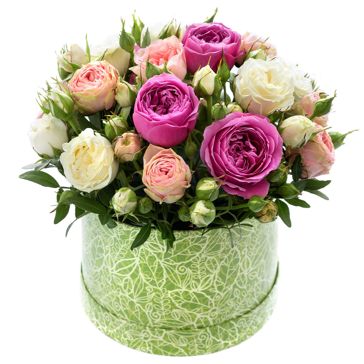 Роза пионовидная сиреневая, роза кустовая пионовидная розовая и белая. Упаковка (шляпная коробка, квадратный бокс, коробка сердце, оазис)